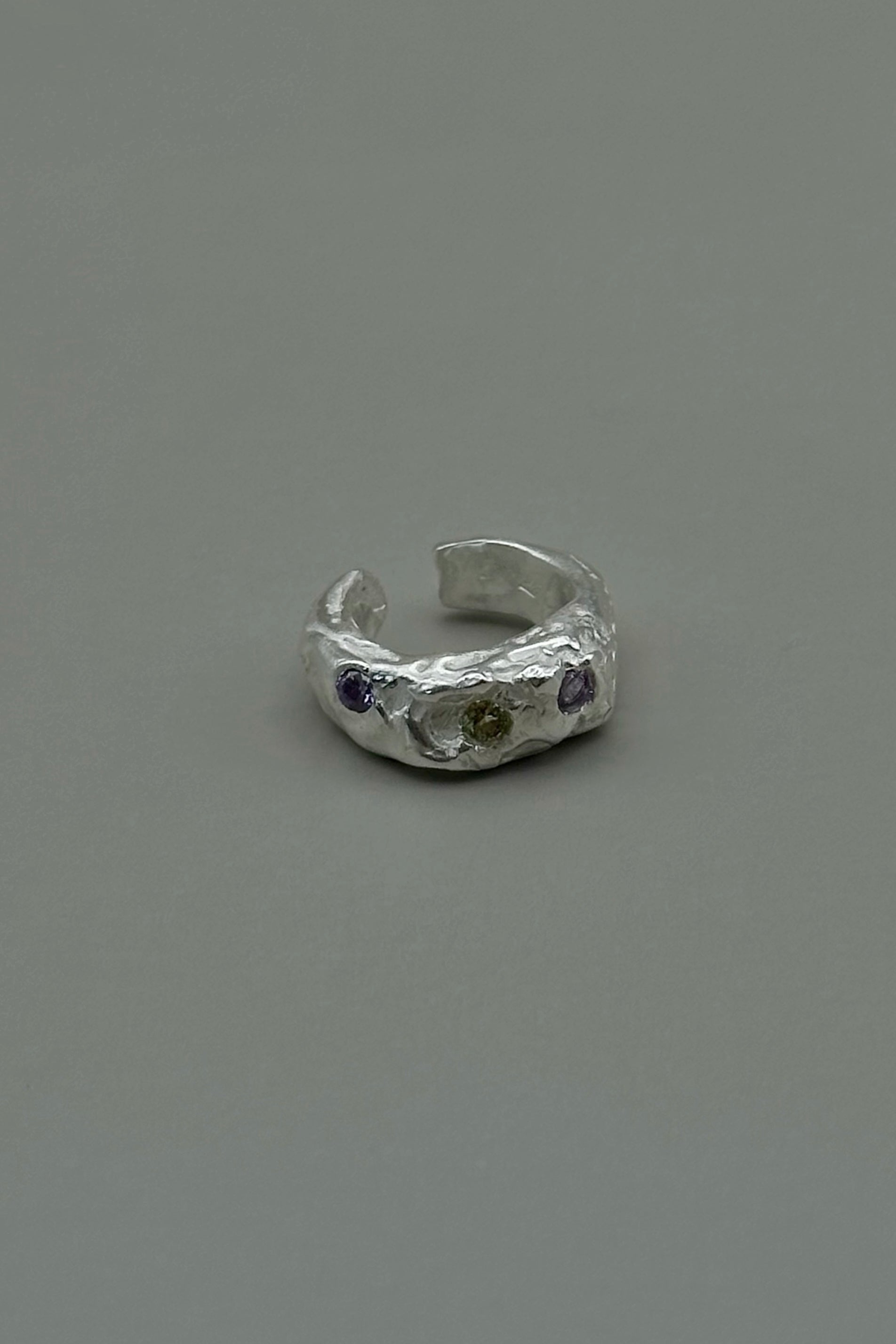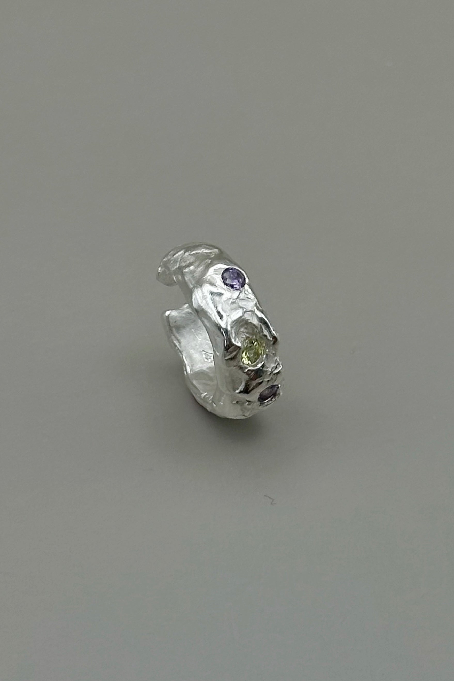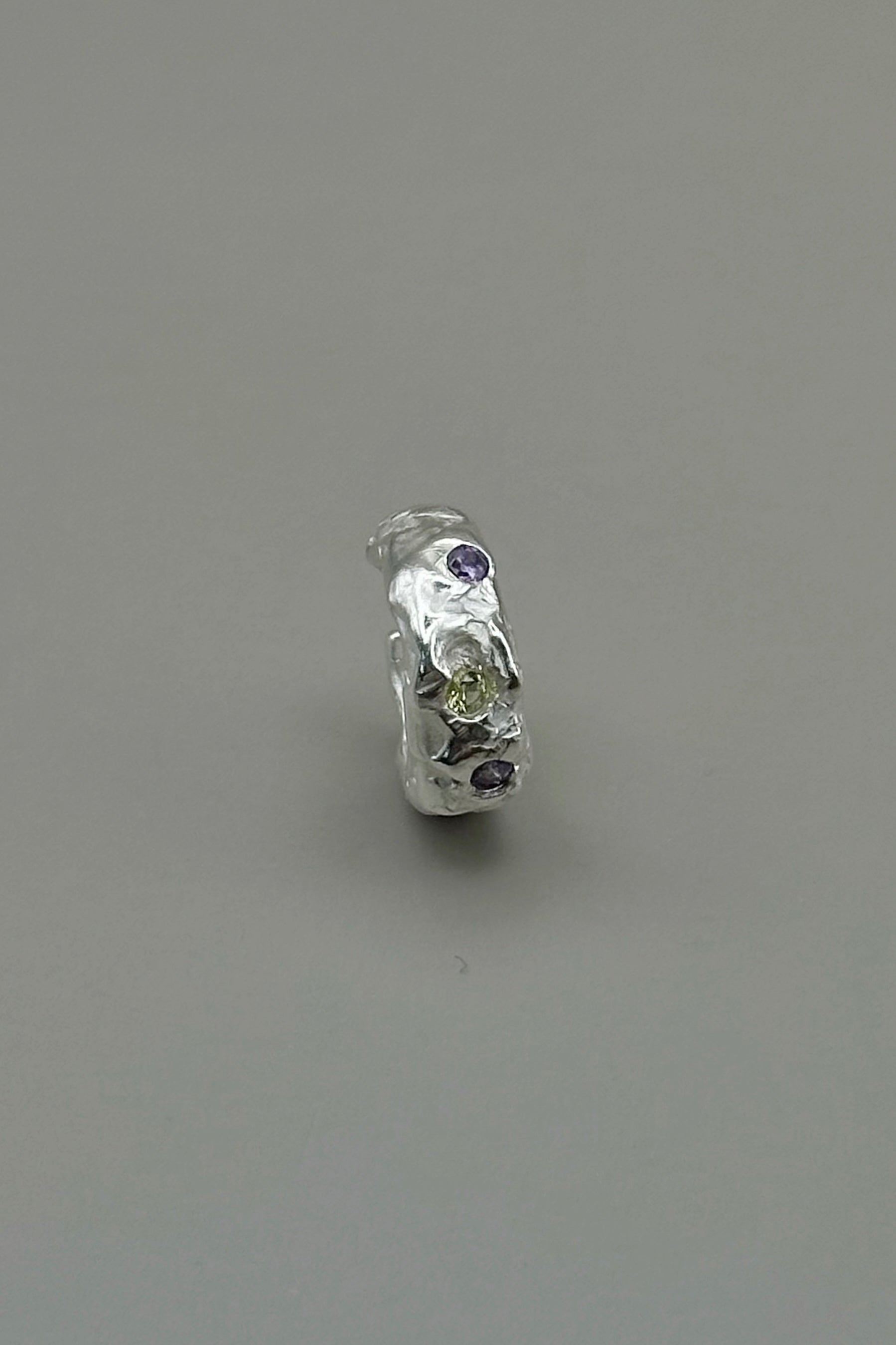 This foil-inspired ear cuff is crafted from sterling silver, featuring a green peridot and two violet amethysts. The design mimics the organic texture of crumpled foil.