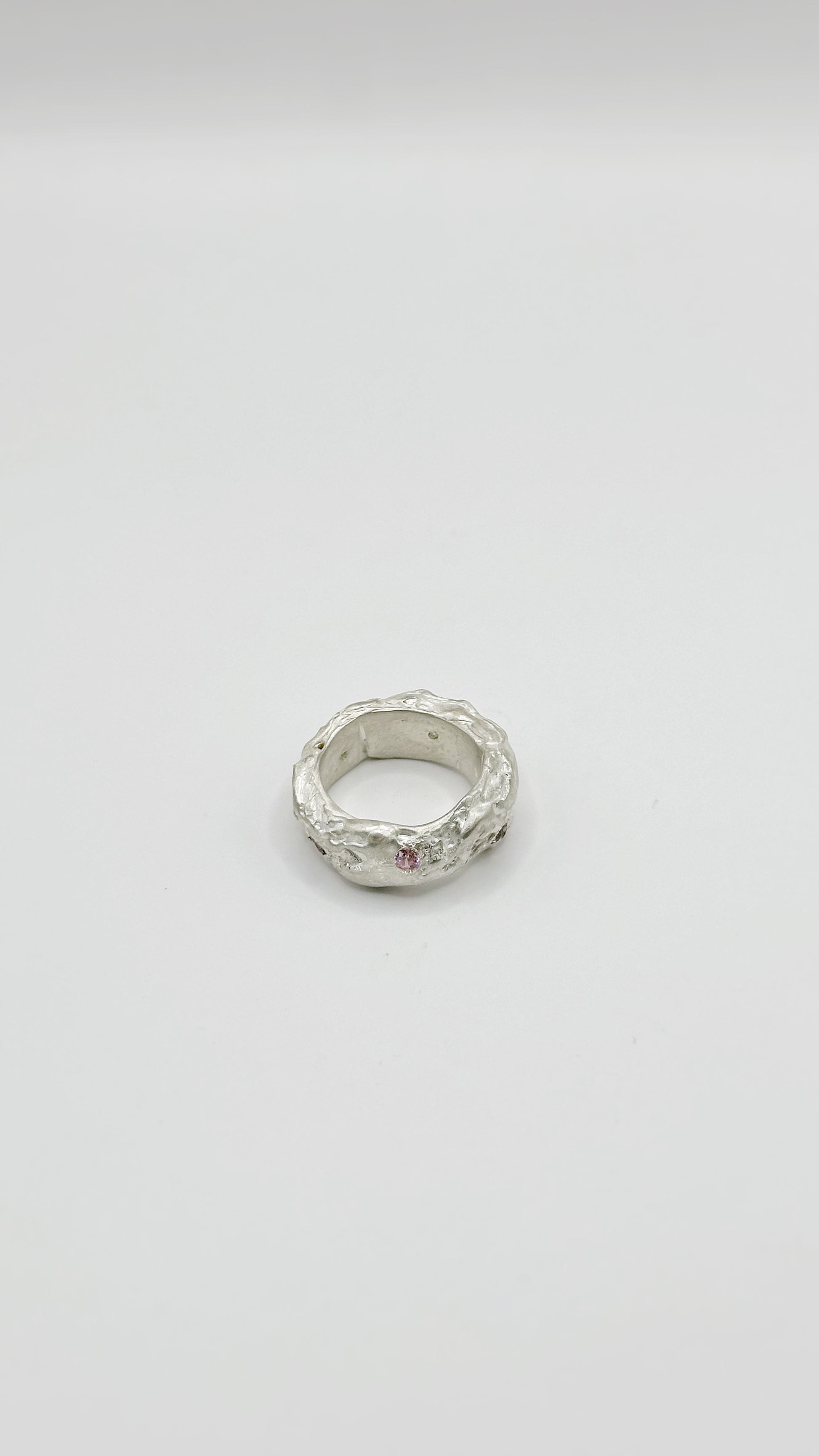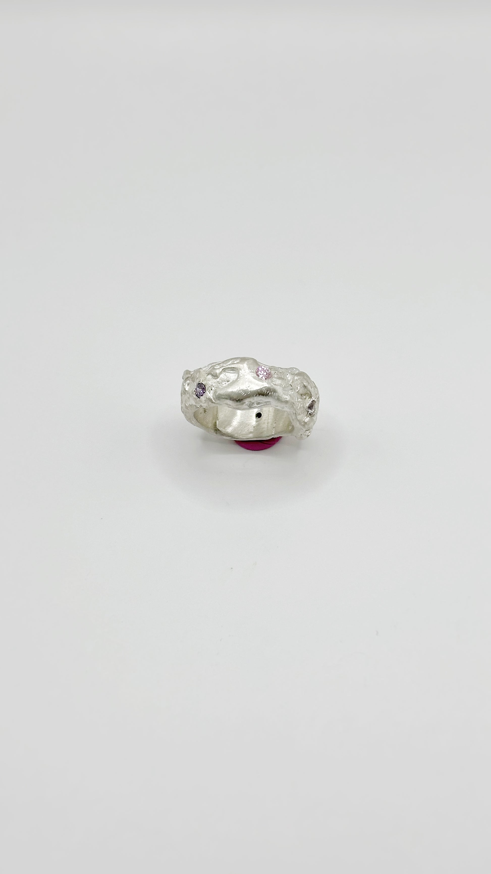 This foil-inspired ring is crafted from sterling silver, featuring green peridots, violet amethysts and pink cubic zircon. The design mimics the organic texture of crumpled foil.