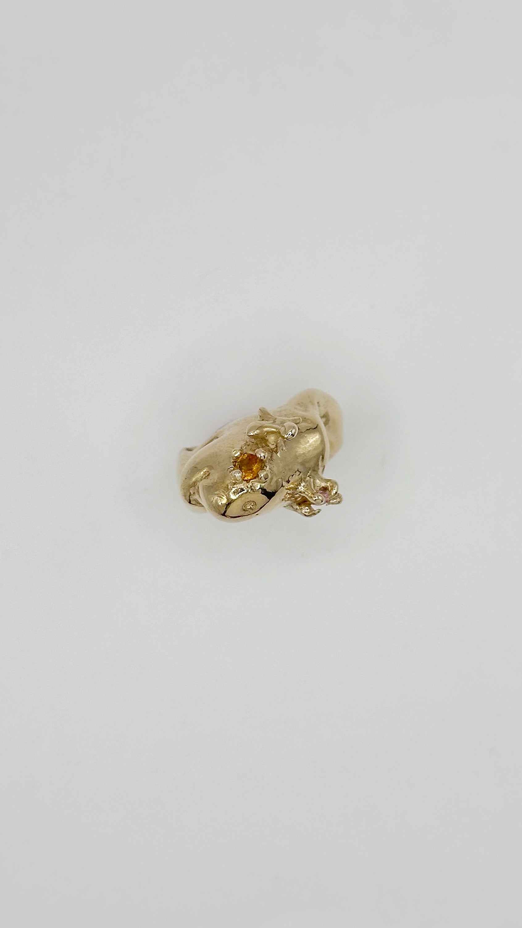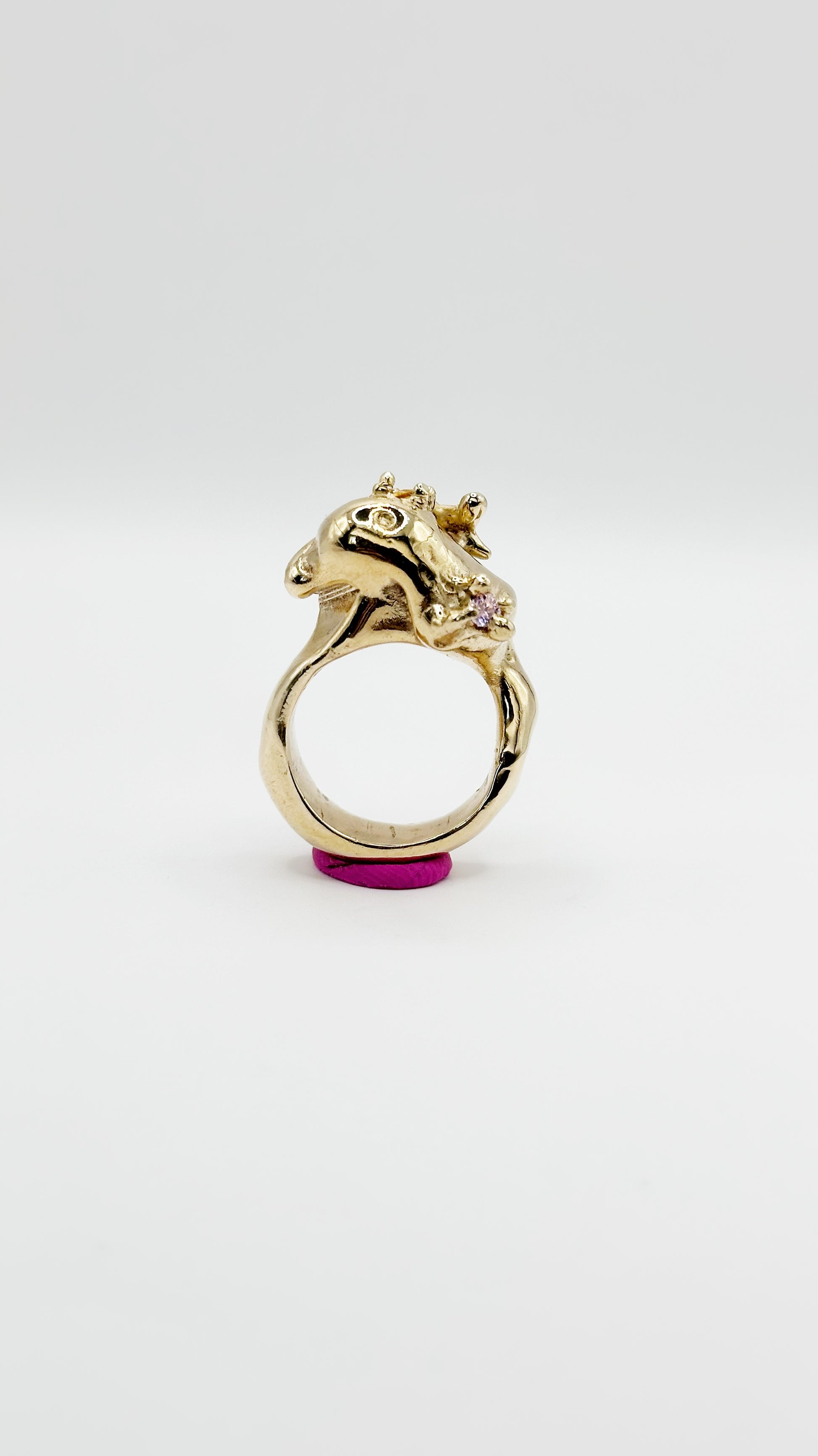 This solid bronze ring features a delicate butterfly and two flowers, adorned with yellow citrine and pink cubic zirconia. It’s available in size 53 EU and is ready to ship