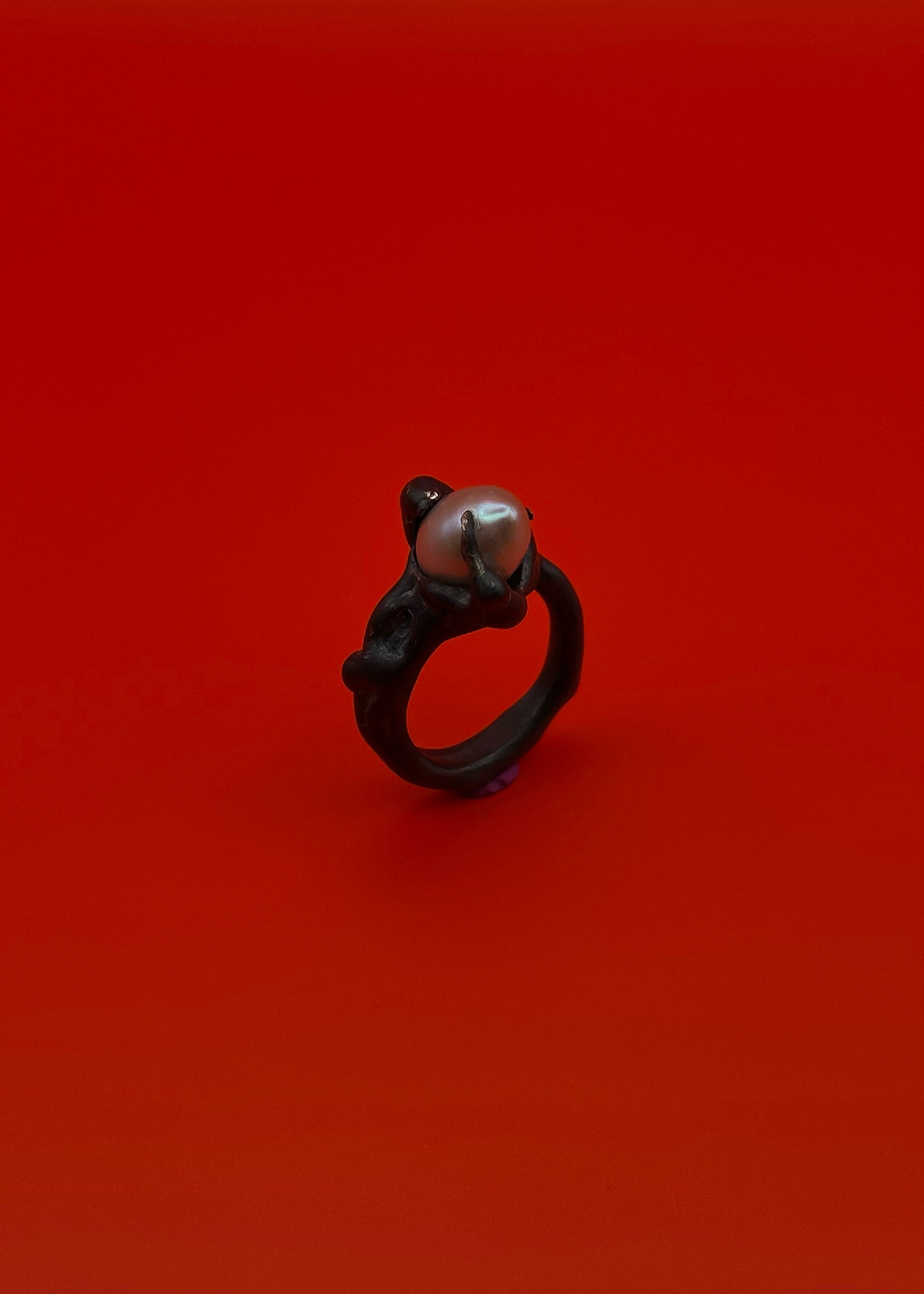 This one-of-a-kind ring is crafted from oxidised sterling silver and features a freshwater pearl. It comes with a unique ceramic box handmade by odt.33. The ring is available in size 55 EU and cannot be resized. Please note that the oxidised finish may fade over time, adding to the piece’s natural character. It’s ready to ship.