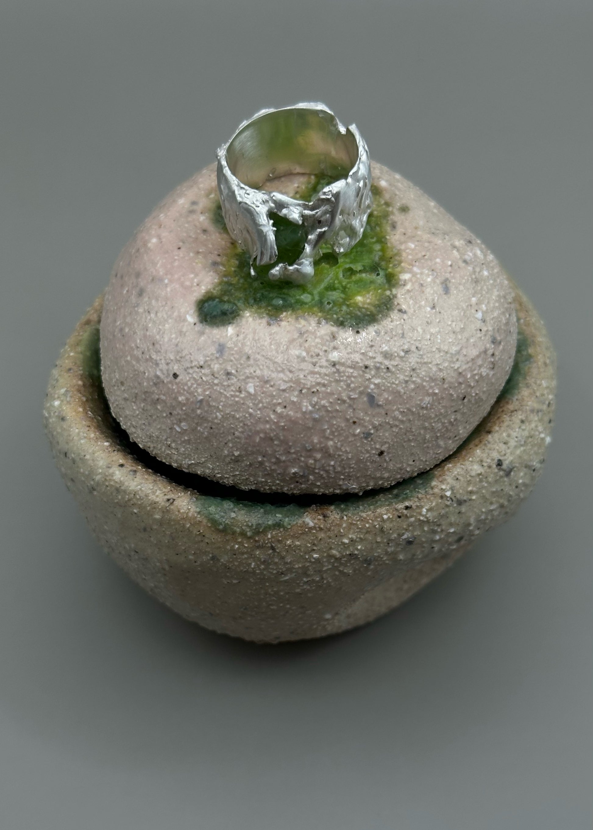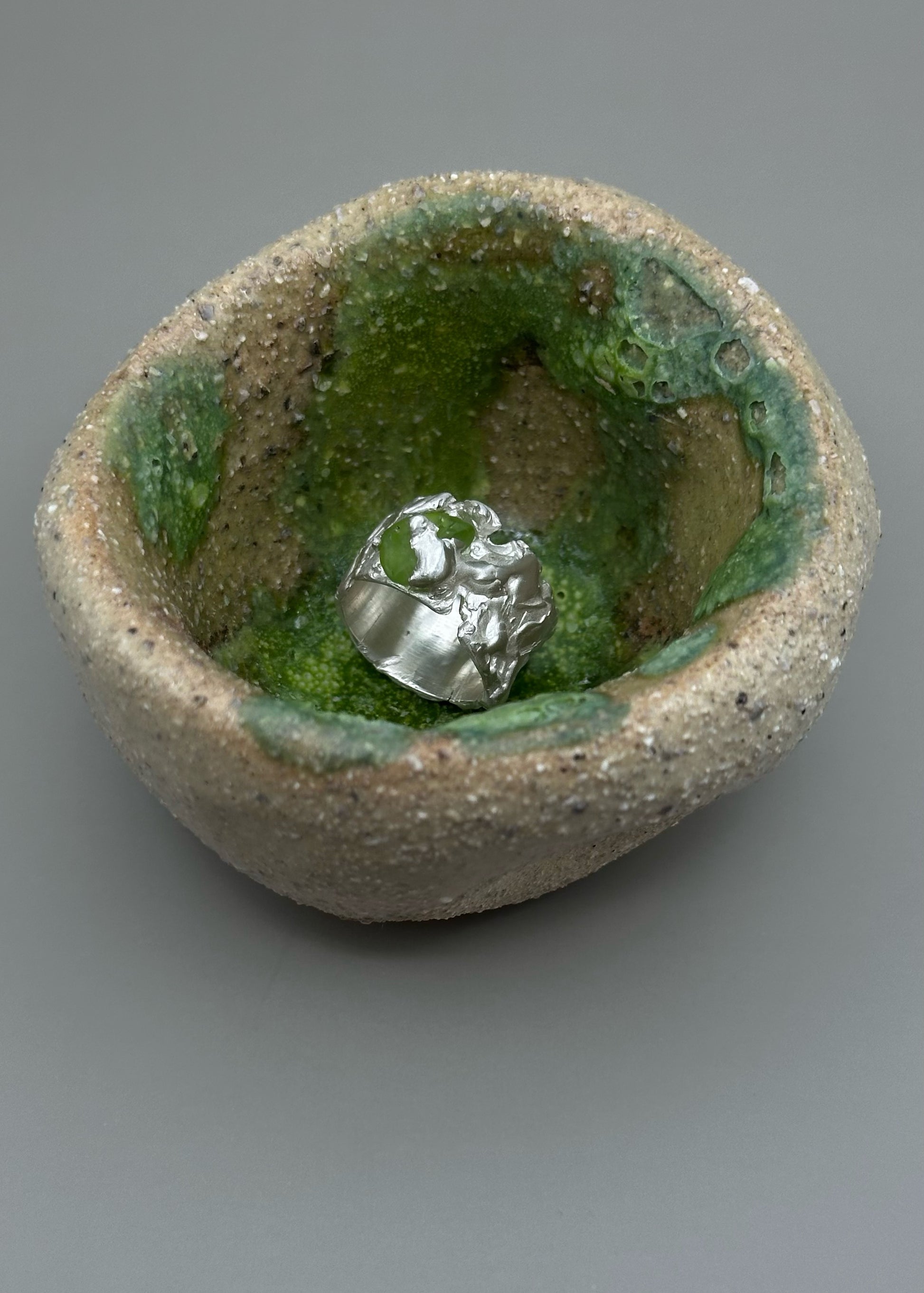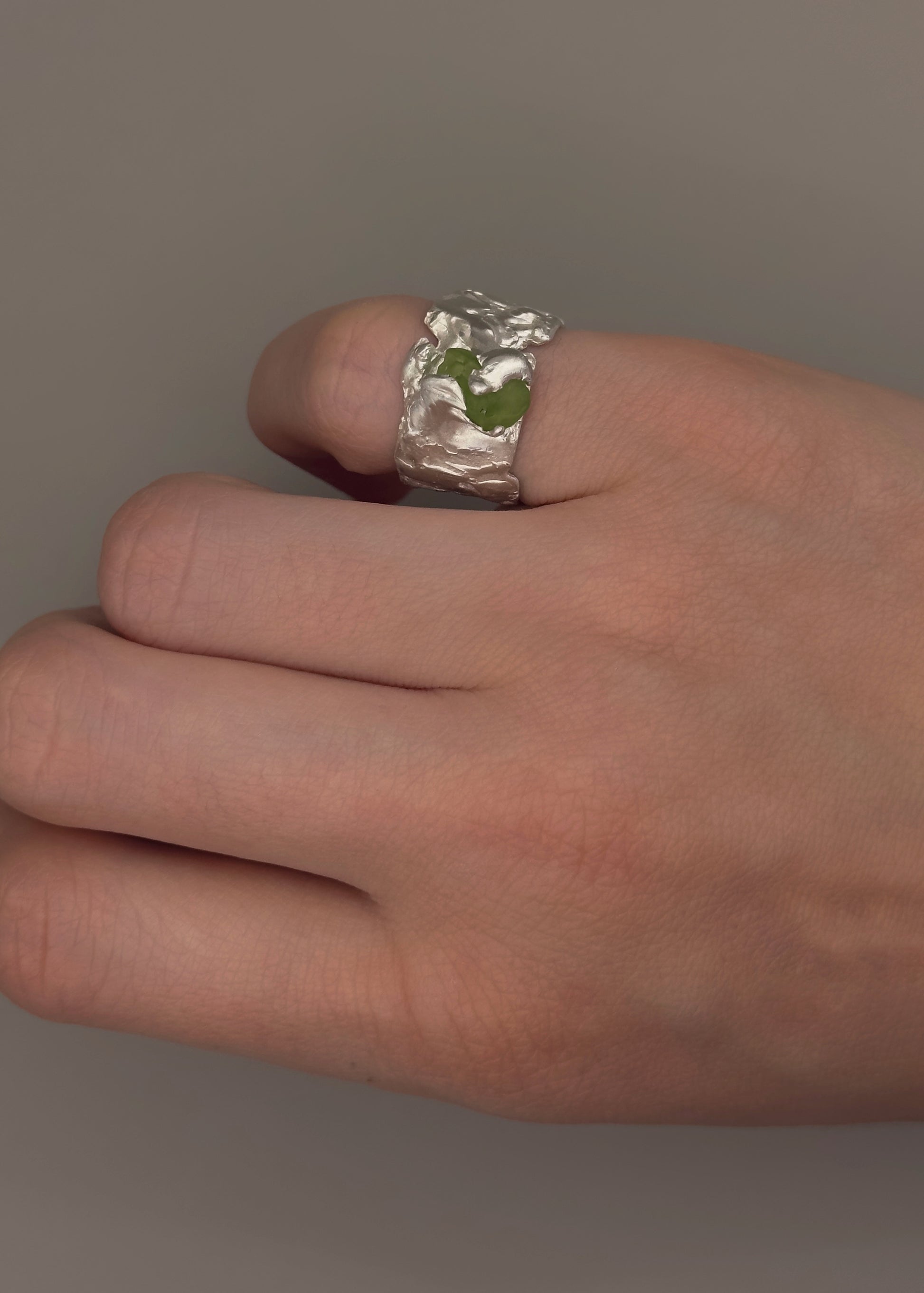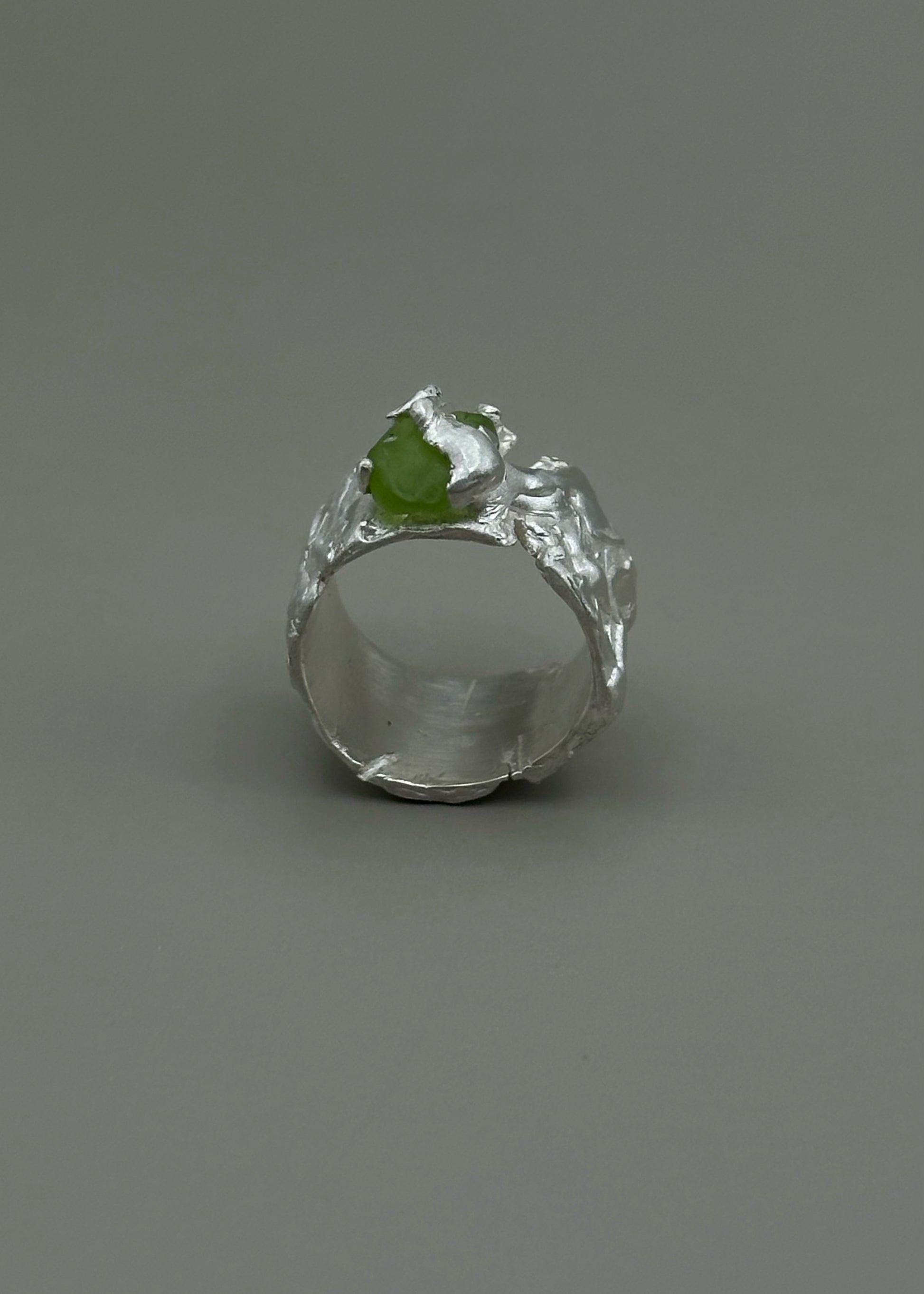 This one-of-a-kind ring is crafted from sterling silver and features a beautiful rough peridot.