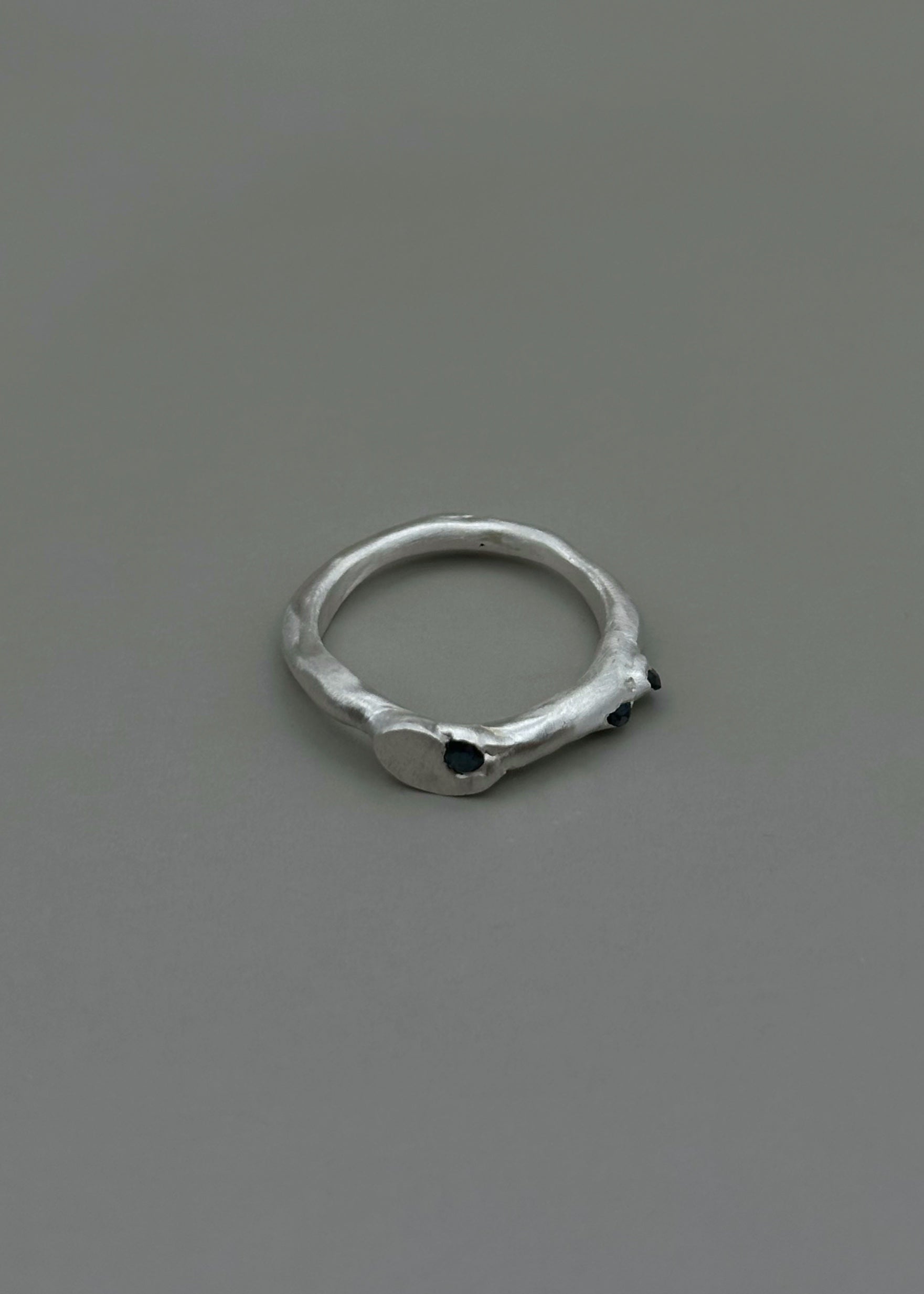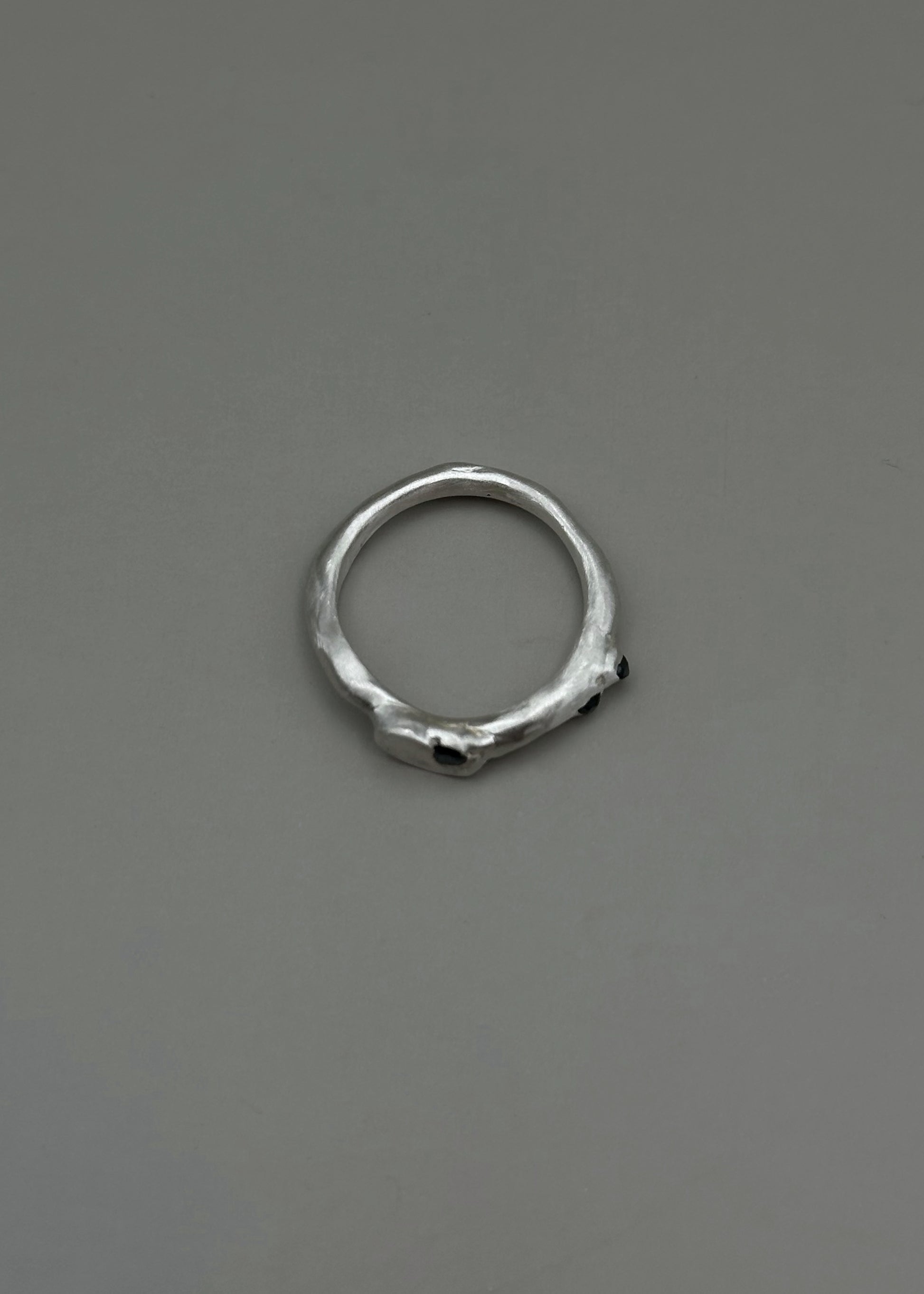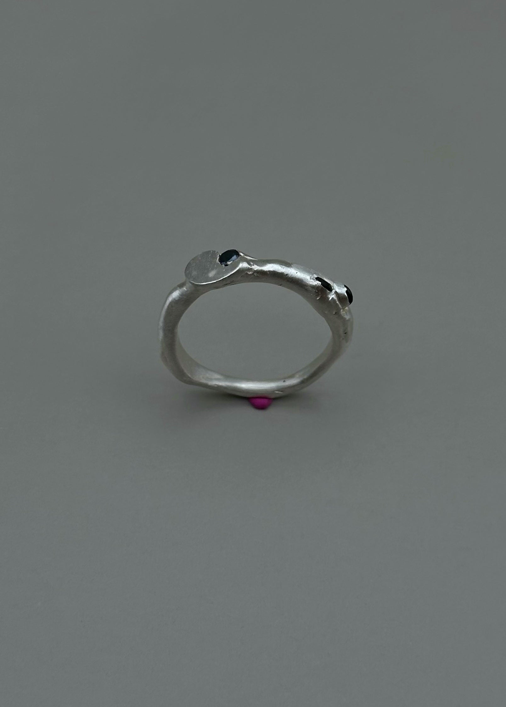 This one-of-a-kind ring is crafted from sterling silver and features three black spinels cast in place, creating a unique effect of the stones appearing to merge with the metal. It comes with a unique ceramic box handmade by odt.33. The ring is available in size 53 EU and cannot be resized. It’s ready to ship.