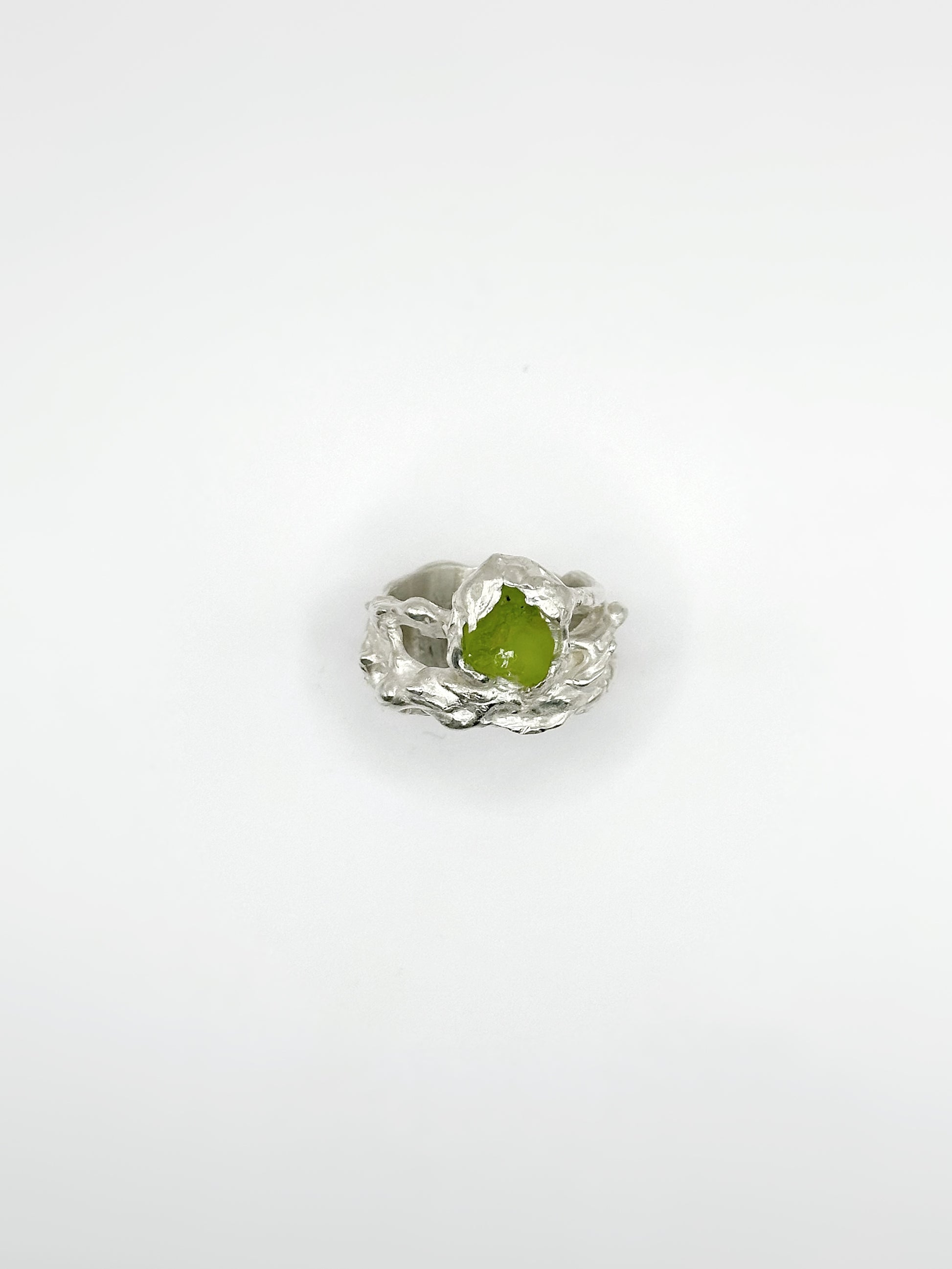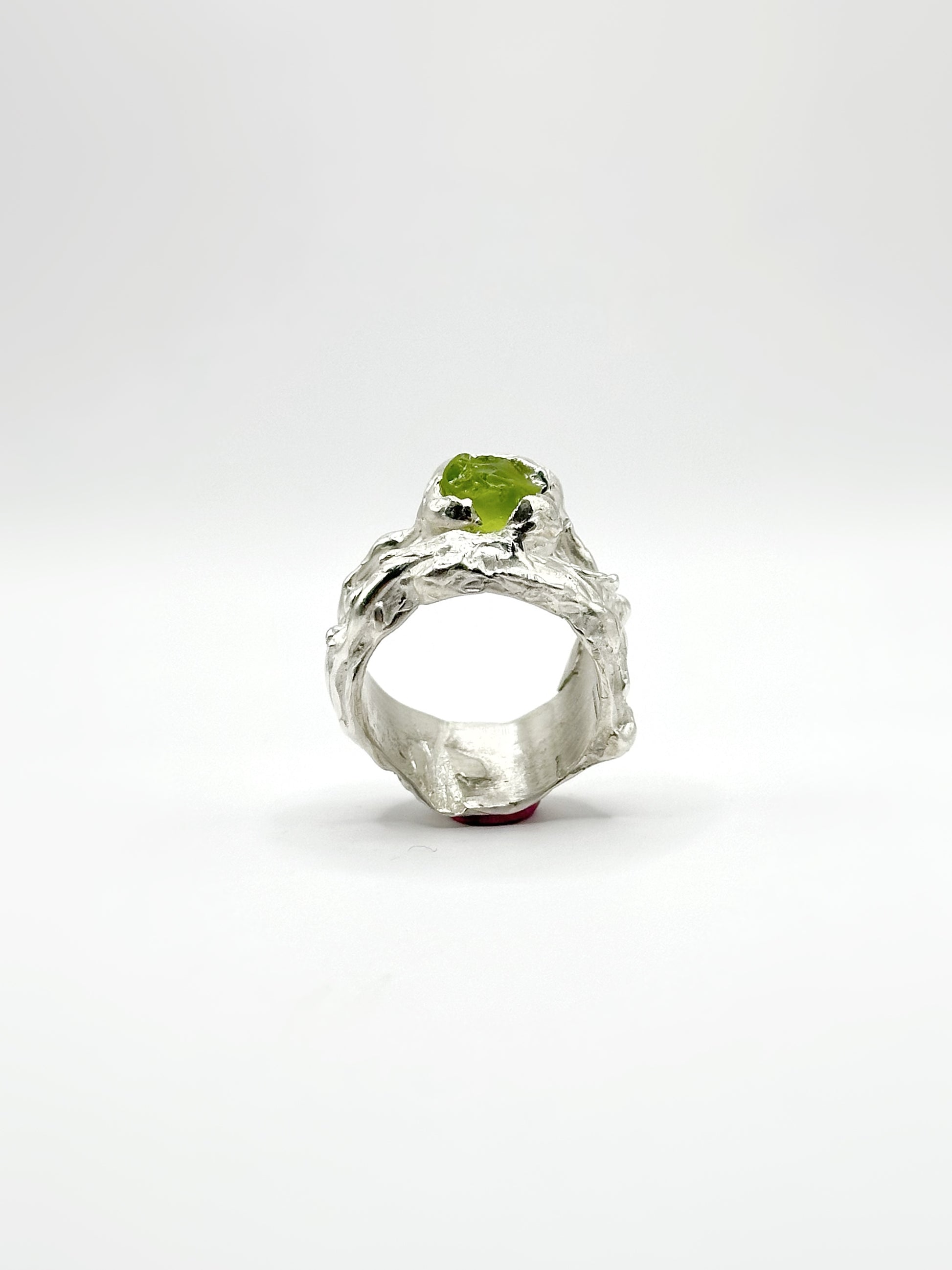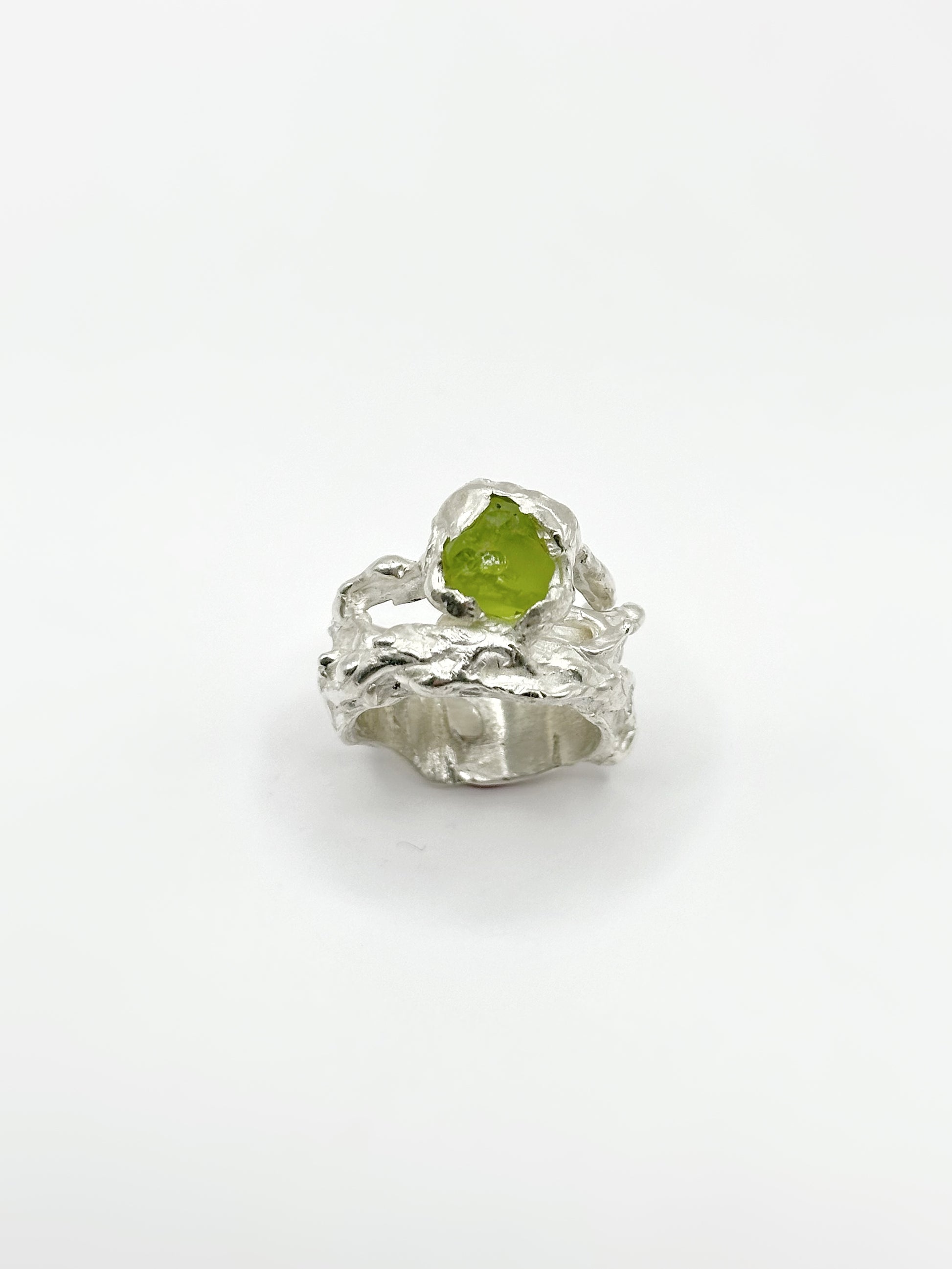 Ring featuring a unique, rough green peridot. This piece showcases a distinctive gemstone, making it truly special.